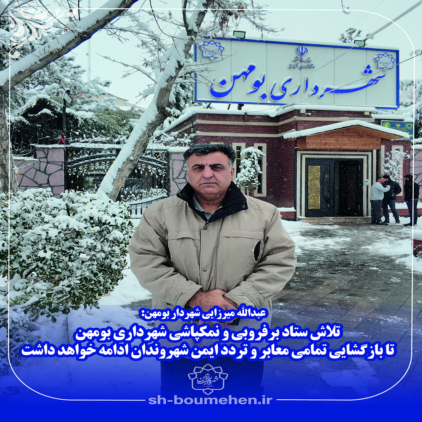 عبدالله میرزایی، شهردار بومهن:"اهتزاز از تجلیات گذران دنیوی و نیل به ارزشهای مانا، صفت و ذات بندگی است. بدین سبب، بندگی اگر در بطن امور ما نمود و بروز یابد، موجب دوری از فرو رفتن در ورطه زخارف ناپایدار دنیوی خواهد شد. چنانکه دنیا گذرگاه است و نه منزلگاه.با همین نگاه؛ اتکا به مفاهیم متعالی همچون «خدمترسانی»، «عدالت ورزی و مبارزه با فساد»، «مشارکت مردم»، «مدیریت جهادی»، «کاهش شکاف و سطح برخورداری مردم» و سایر گزاره ها، جملگی از شاخص-های مورد توجه رهبری معظم انقلاب اسلامی در بیانیه فاخر گام دوم انقلاب هستند. مفاهیمی که واجد ارتباطی درهم تنیده با فصلهای عملکردی مدیریت شهری هستند و چنانکه در سرفصل های برنامه ریزی مدیریت کلان شهر بومهن نیز، این رویکردها در کنار تخصص محوری، به صورت ویژه مورد توجه قرار گرفته است. از این رو مساعی مدیریت شهری بر «افزایش سرانه خدمات مناطق کم برخوردار»، «توازن سرانه فضای شهری، تفرجگاهی و خدمات» در کنار «قانونمداری، شفافیت، نظارت و ارتقای سلامت اداری» خواهد بود که ارتباط تنگاتنگی با منویات و محورهای اسناد راهبردی کشور دارد. به این واسطه؛ حضور در میدان، عملگرایی و تلاش بی دریغ در مسیر تجلی و اثبات امر «ما می توانیم»، از مراتب حیاتی و اصلی در مدیریت شهری منطقه شهید پرور بومهن در ایام پیش رو خواهد بود.